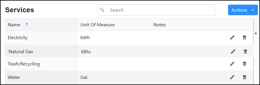 Users with the Add, Remove, or Update Services permissions can manage services and utility types. Services must be associated with a specific unit of measure. When bills are added to the system, line items can be added to track specific utility costs, such as kWh.