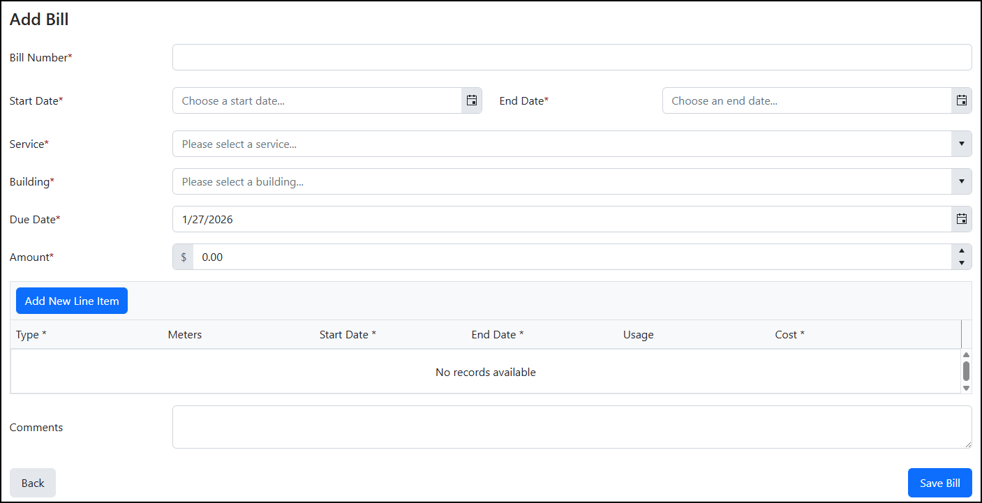viii. To add any desired line items, click Add New Line Item, then enter the Type, Meter, Start Date, End Date, Usage, and Cost.
