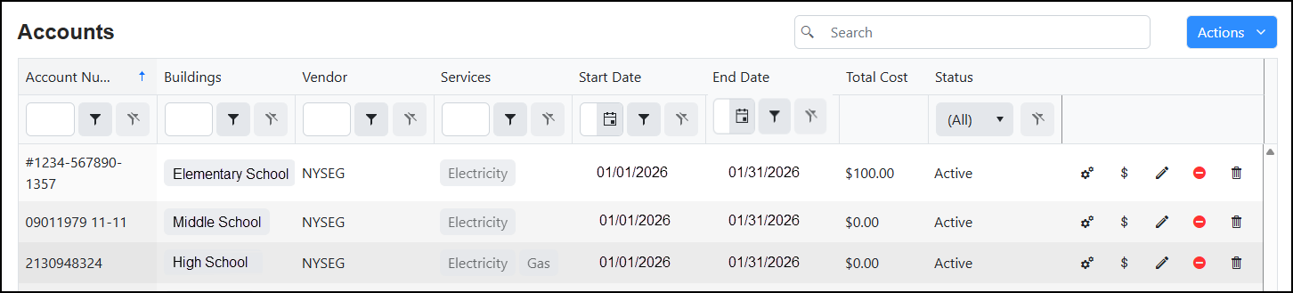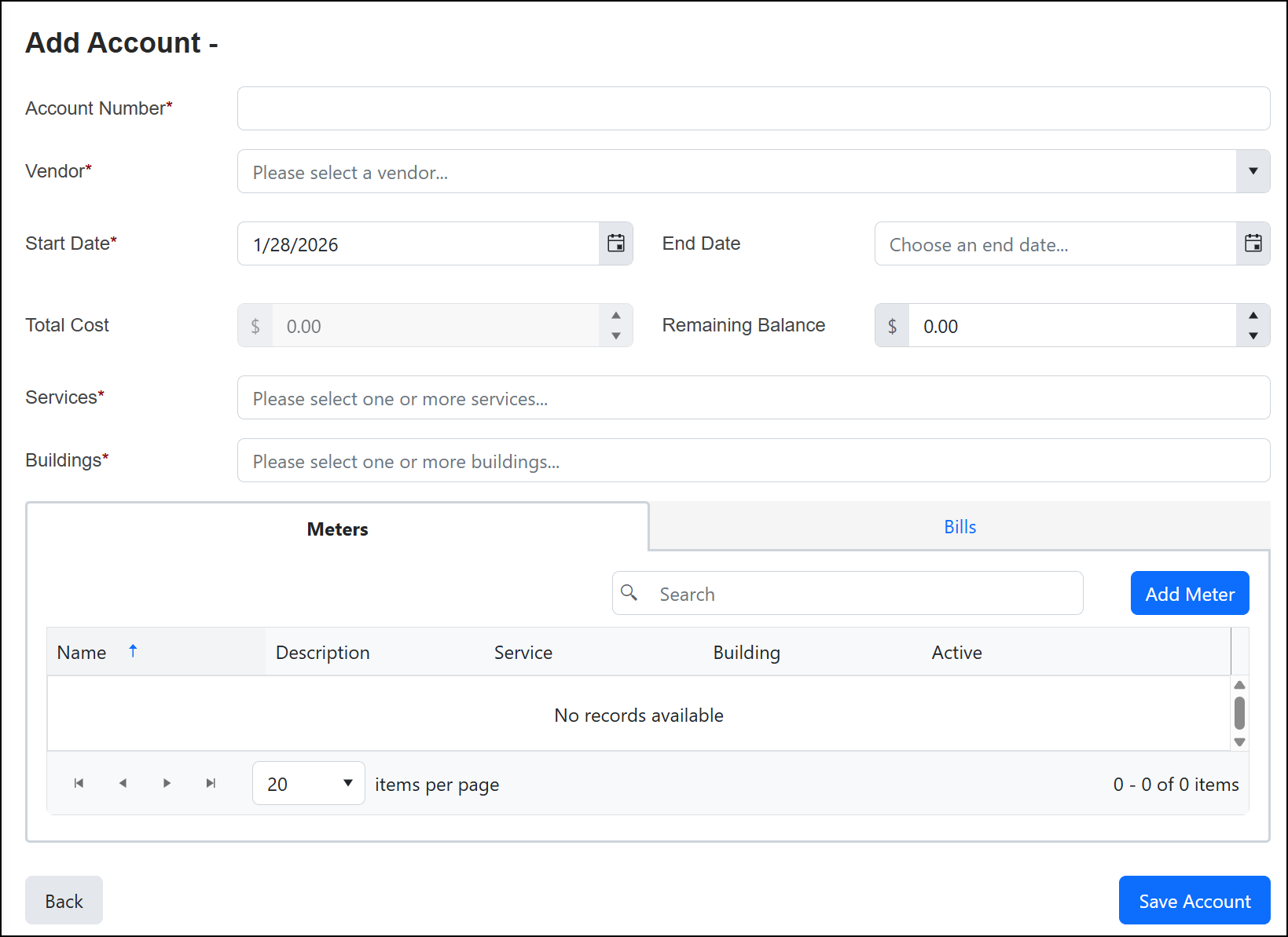 Users with the Add, Remove, or Update Accounts permissions can create accounts, as well as manage the bills and meters within them.